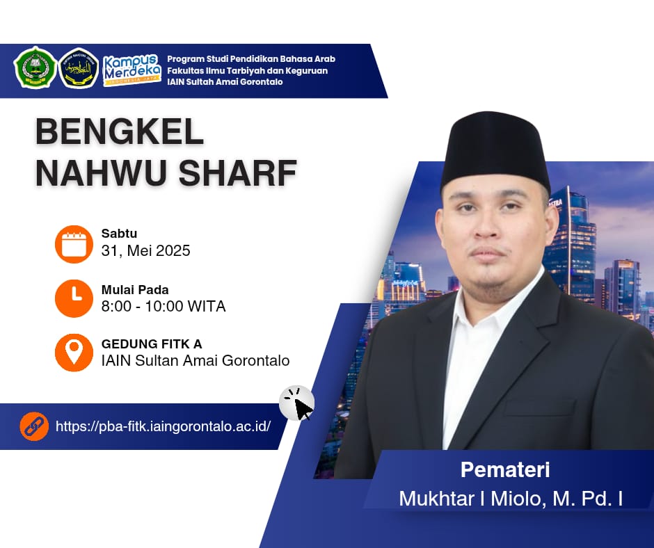 Gorontalo, 31 Mei 2025 – Mahasiswa jurusan Pendidikan Bahasa Arab (PBA) Fakultas Ilmu Tarbiyah dan Keguruan (FITK) IAIN Sultan Amai Gorontalo mengikuti kegiatan bertajuk “Bengkel Nahwu Sharaf” yang diselenggarakan di ruang seminar FITK. Kegiatan ini bertujuan untuk memperdalam pemahaman mahasiswa mengenai tata bahasa Arab, khususnya dalam aspek nahwu dan sharaf.