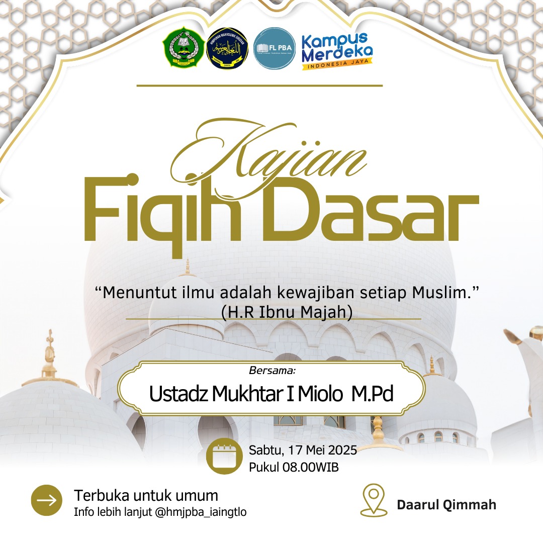 Gorontalo, Sabtu 17 Mei 2025_Mahasiswa jurusan Pendidikan Bahasa Arab (PBA) Fakultas Ilmu Tarbiyah dan Keguruan (FITK) IAIN Sultan Amai Gorontalo mengikuti Kajian Fiqih Dasar yang diselenggarakan oleh Himpunan Mahasiswa Jurusan PBA. Acara ini berlangsung di Daarul Qimmah dan dihadiri oleh sejumlah peserta yang antusias untuk menambah pengetahuan agama mereka.