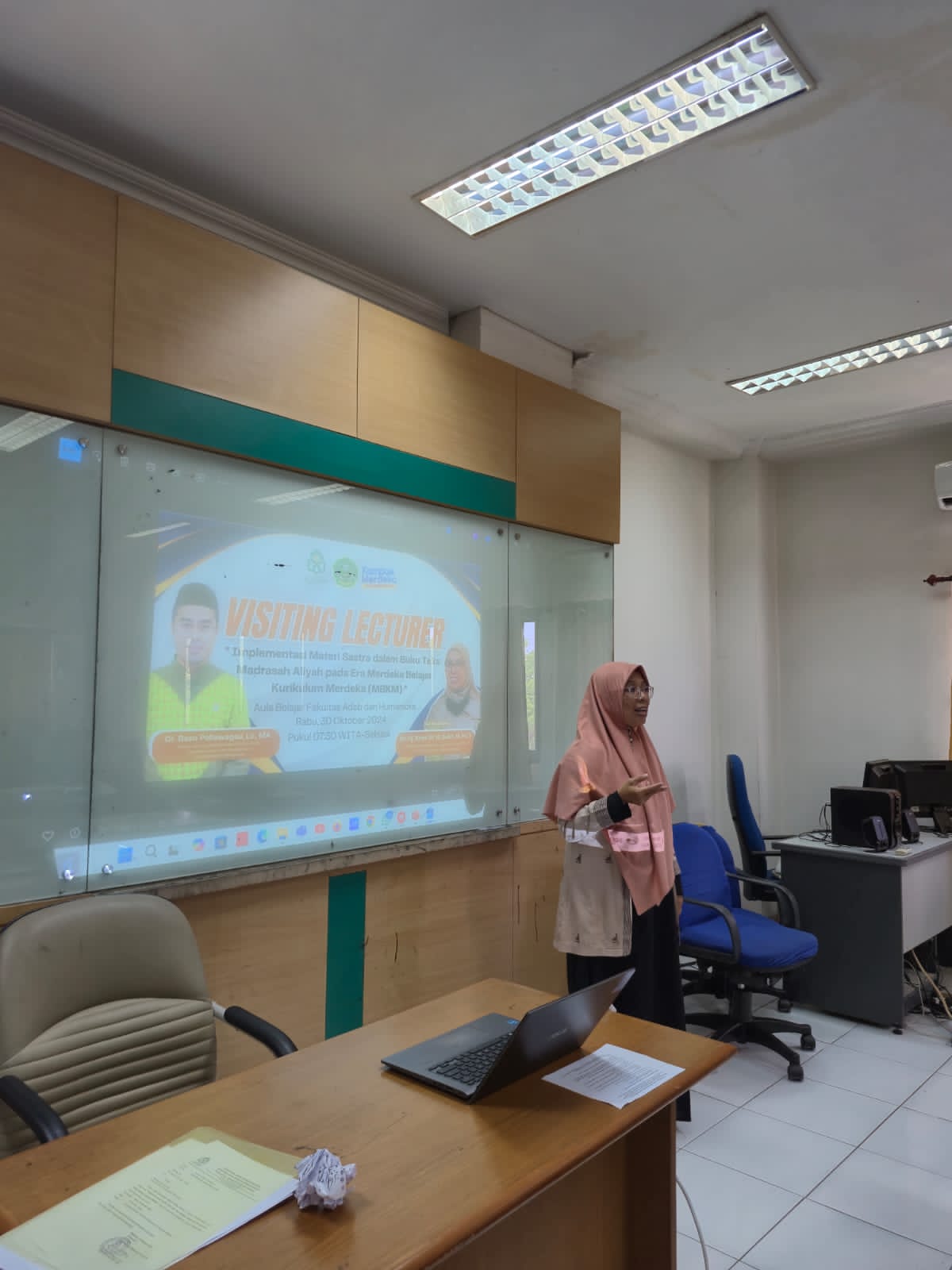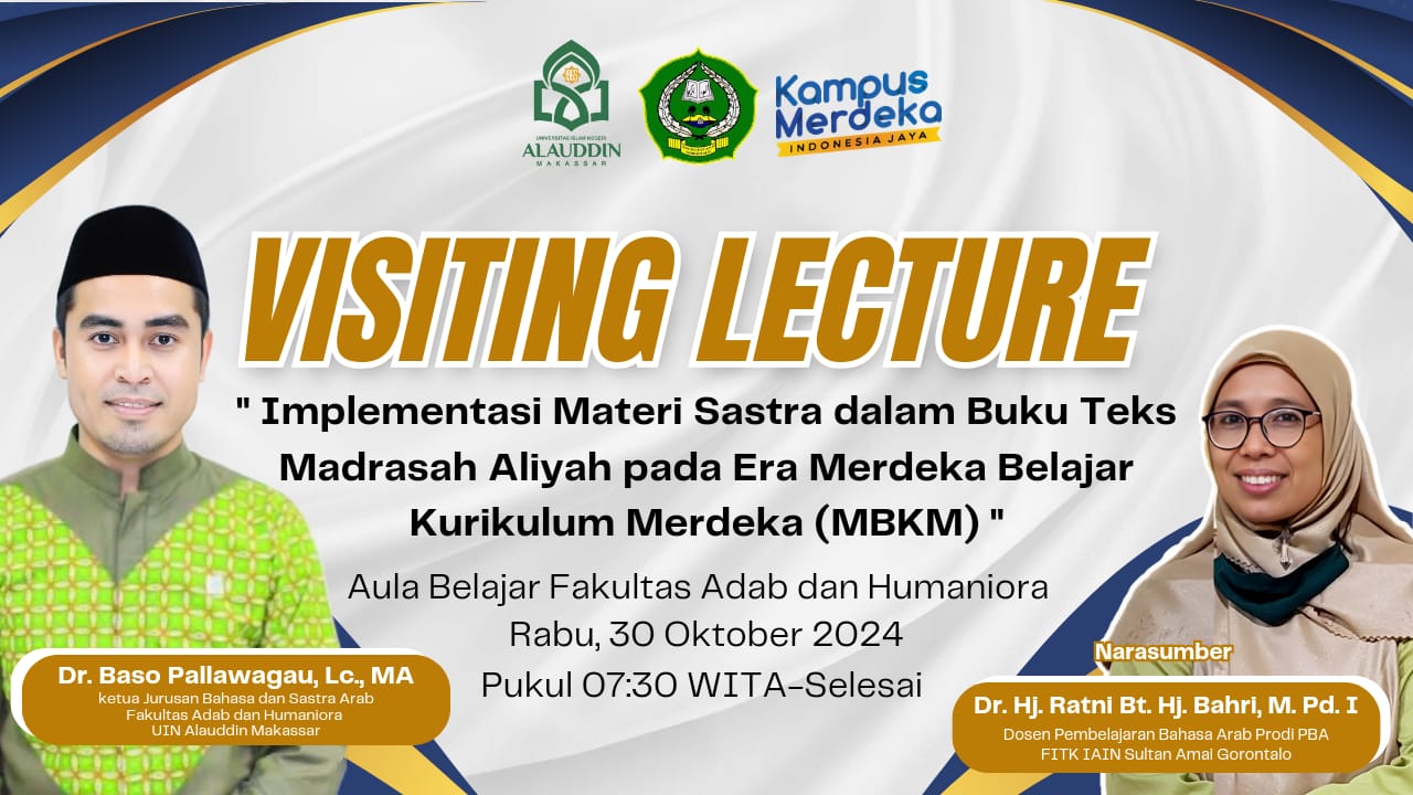 Gorontalo, 30 Oktober 2024 – Dosen Program Studi Pendidikan Bahasa Arab (PBA) FITK IAIN Sultan Amai Gorontalo, Dr. Ratni Bt. Hj. Bahri, M.Pd.I, menjadi narasumber dalam kegiatan Visiting Lecture yang diselenggarakan oleh Jurusan Bahasa dan Sastra Arab Fakultas Adab dan Humaniora UIN Alauddin Makassar. Acara ini berlangsung di Aula Belajar Fakultas Adab dan Humaniora dengan tema “Implementasi Materi Sastra dalam Buku Teks Madrasah Aliyah pada Era Merdeka Belajar Kurikulum Merdeka (MBKM)” dan dihadiri oleh dosen dan mahasiswa Sastra Arab Fak. Adab dan Humaniora UIN Alauddin Makassar.