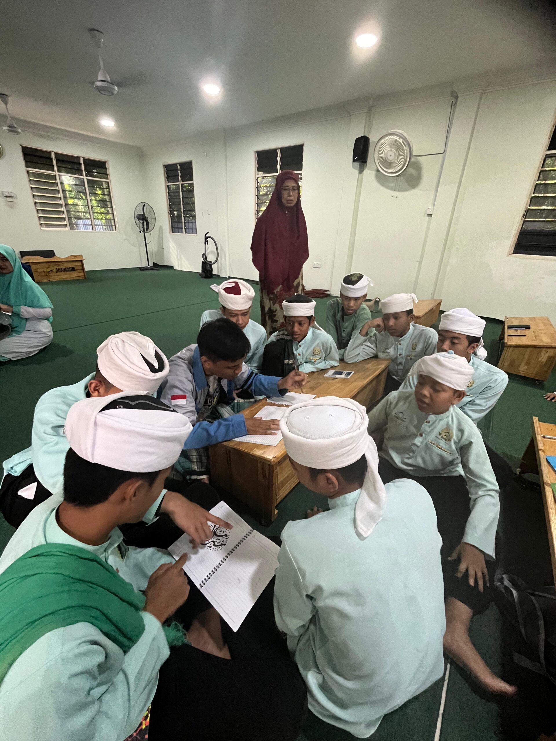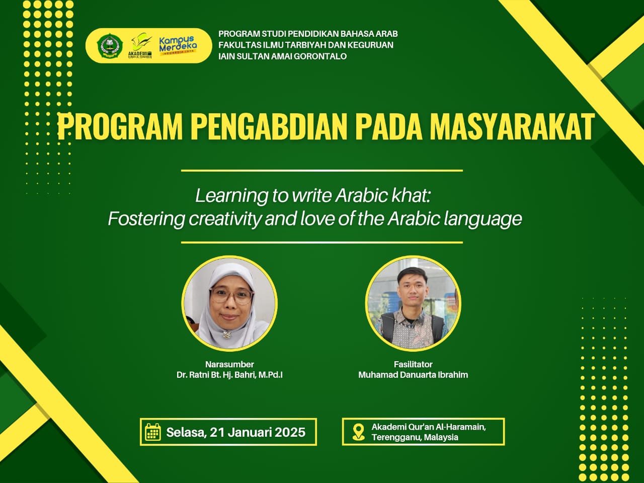 Malaysia_Ketua Jurusan Pendidikan Bahasa Arab Fakultas Ilmu Tarbiyah dan Keguruan (FITK) IAIN Sultan Amai Gorontalo, Dr. Ratni Bt. Hj. Bahri, M.Pd.I, telah sukses melaksanakan Program Pengabdian pada Masyarakat (PkM) Internasional dengan tema “Learning to Write Arabic Khat: Fostering Creativity and Love of The Arabic Language”. Kegiatan ini berlangsung di Akademi Qur’an Al-Haramain, Malaysia, pada tanggal 21 Januari 2025. Kegiatan ini dihadiri oleh sekretaris jurusan Mukhtar I. Miolo, M.Pd, dosen pembimbing Suharia Sarif, M.Pd.I, pengelola program kebahasaaan Akademi Qur’an Al-Haramain Abdul Rahim bin Ismail, SH.,M.A, pengelola asrama dan kesiswaan Muhammad Abu Naim Bin Abu Bakar, mahasiswa, pelajar Akademi Qur’an Al-Haramain dan pelajar Madrasah Seberang Tuan Chik.