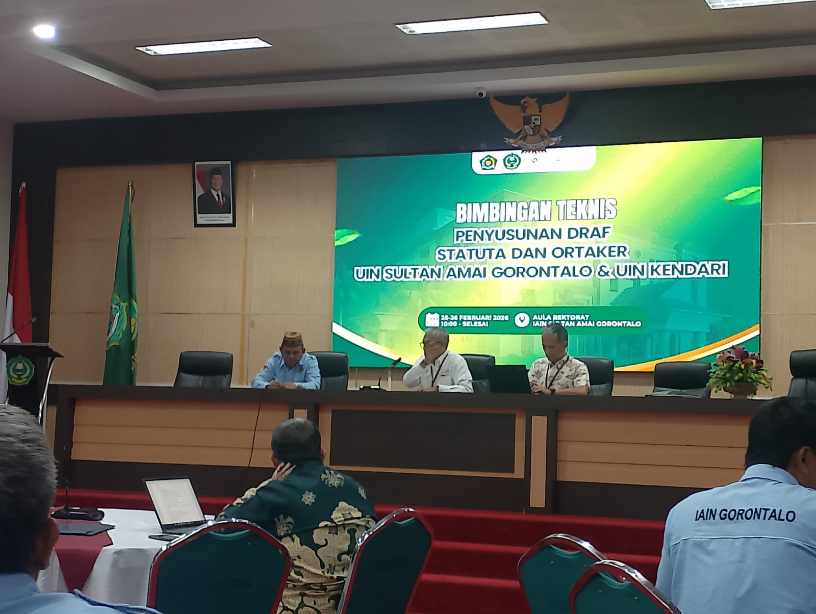 Gorontalo, Kamis 26 Februari 2026_Pimpinan Program Studi Pendidikan Bahasa Arab Fakultas Ilmu Tarbiyah dan Keguruan (FITK) IAIN Sultan Amai Gorontalo Mukhtar I. Miolo, M.Pd dan Suharia Sarif, M.Pd.I mengikuti kegiatan Bimbingan Teknis (Bimtek) Pembahasan Draf Rancangan Ortaker dan Statuta IAIN Sultan Amai Gorontalo. Kegiatan berlangsung selama dua hari, Rabu hingga Kamis, 25–26 Februari 2026, bertempat di Aula Rektorat lantai 4.